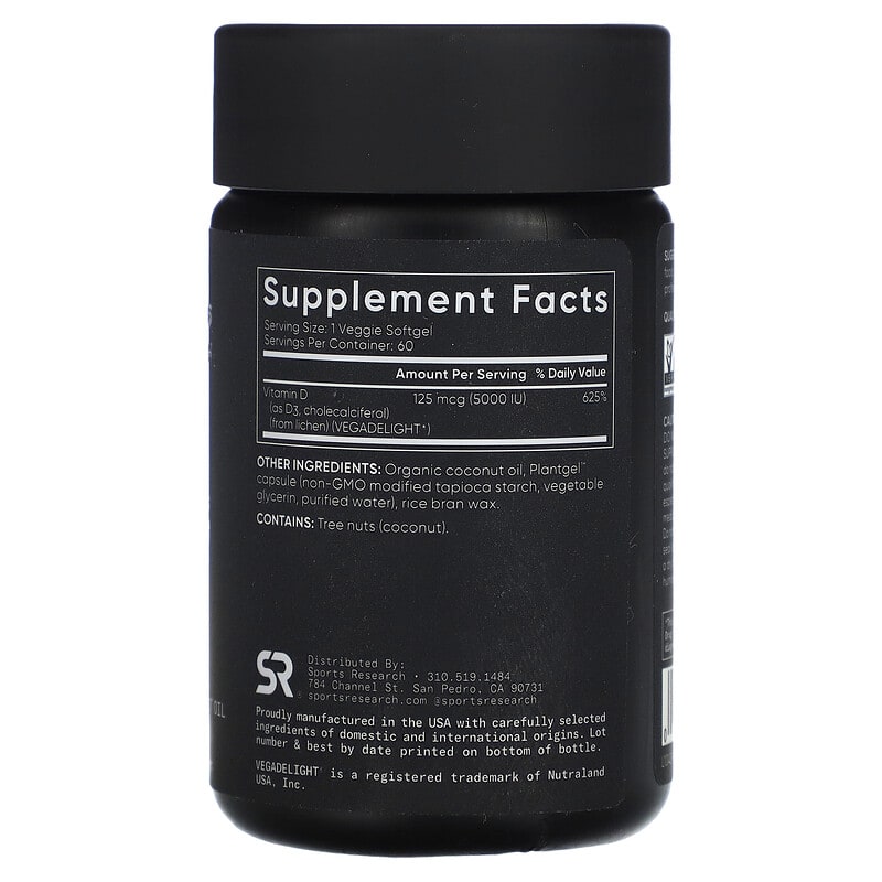 Thực phẩm chức năng Sports Research Vegan Vitamin D3 125 mcg (5.000 IU) 60 Veggie Softgels chính hãng nhập khẩu từ Mỹ, Mã vạch 023249011491, Quy cách: 0.05 kg, 60 viên