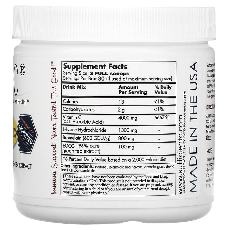 We Drink To Your Best Health™ Riordan Clinic ApprovedL-Lysine Bromelain96% Pure & Caffeine Free Green Tea ExtractVerified Non-GMO™ Kosher Dietary Supplement Immune Support Never Tasted This Good™ Gluten-FreeSugar-FreeGMP – Good Manufacturing Practice, Consistent QualitySufficient-C® not only supports your immune system, this unique, lemon-peach immune-ade drink mix provides satisfying, refreshing, non-GMO flavor with function in each, thirst-quenching sip! Food For ThoughtHave you ever heard of a lion or tiger suffering from the common cold? Fortunately for them and most species, they are able to synthesize large amounts of vitamin C daily and even more as needed! Humans lost this ability due to a gene mutation. Given humans are unable to produce vitamin C nor store it for very long, it should not be a surprise that a sufficient, consistent, daily supply is necessary to help battle the various immune assaults that are an unavoidable part of everyday life. †Supports a Healthy Immune & Inflammation Response