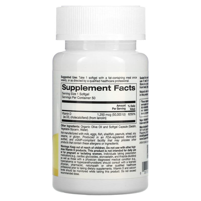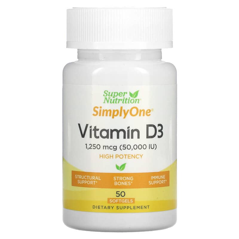 Super Nutrition SimplyOne Vitamin D3Formulated with Vitamin D3, CholecalciferolFeaturing a High Potency Dose of 1, 250 mg (50, 000 IU)Structural and Immune Support*Supports Strong Bones*Formulated without Gluten, GMOs, or SoyScientifically-Developed Dietary Supplement