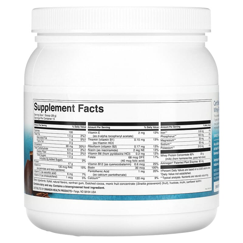 Thực phẩm chức năng Swanson Certified rBGH-Free Grass-Fed Whey Protein Powder Chocolate 14.8 oz (420 g) chính hãng nhập khẩu từ Mỹ, Mã vạch 087614024752, Quy cách: 0.51 kg, 14.8 oz