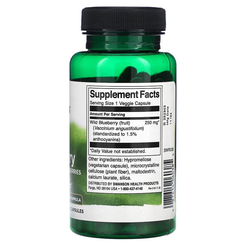Antioxidant Support250 mg Per CapsuleGreen Foods FormulaHerbal SupplementVegetableAdd Purple Color To Your DietSourced Directly From NatureScience-Backed Quality Since 1969Provides anthocyanins, known antioxidants with multiple health benefits. Swanson Wild Blueberry is standardized to provide 1. 5% anthocyanins, which are free-radical-fighting antioxidants. The brightly colored pigments in fruit are not only beautiful and inviting, but they provide excellent antioxidant protection for the body, too. In fact, the more a fruit stains your clothes, the more it protects your tissues. Win the fight against free radicals with protection from blueberries.