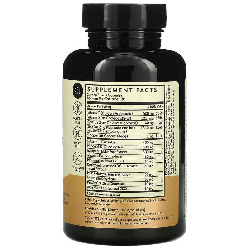 Thực phẩm chức năng Terra Origin Healthy Gut Capsules with Immunity Boost Vitamin C & D 90 Capsules chính hãng nhập khẩu từ Mỹ, Mã vạch 857668007465, Quy cách: 0.11 kg, 90 viên