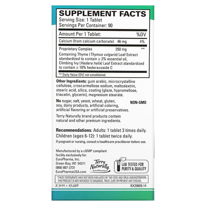 | Proprietary Complex Containing Thyme (Thymus vulgaris) Leaf Extract standardized to contain ≥ 2% essential oil, Climbing Ivy (Hedera helix) Leaf Extract standardized to contain ≥10% hederacoside C |