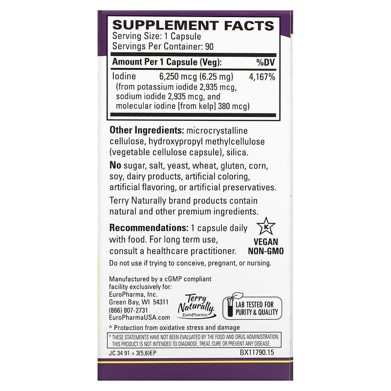 | Iodine (as potassium iodide 2,935 mcg, sodium iodide 2,935 mcg, and molecular iodine [from kelp] 380 mcg) |