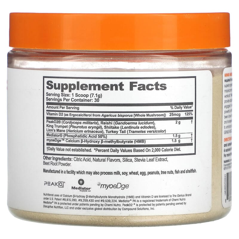 3 Clinically Studied Ingredients No Banned Substances Muscular Health, Function and Performance 100% Naturally Flavored and Sweetened Dietary Supplement Genius muscle builds muscle by scientifically engineering the optimization of every aspect required for muscle growth with measurable results. Our 100% transparent formula contains superior ingredients with 10+ clinical studies. PeakO2® elevates peak power output, improves VO2 max/economy and extends time-to-exhaustion for maximum power output and peak strength workouts. Mediator® Phosphatidic Acid (PA), a patented ingredient, shown in a university study to provide double the muscle mass gain, increased strength and double the fat loss in individuals engaged in weight bearing exercise and who consumed adequate protein. myHMB® is the powerful combination of HMB (B-hydroxy-B-methylbutyrate) and Vitamin D3. These nutrients have been shown to work synergistically to promote muscle health, improve lean muscle mass gains and increase muscle function. HMB is a metabolite of the amino acid leucine known for its ability to enhance protein synthesis, thus promoting muscle growth. Through effort in the gym and genius muscle, real results can be earned!