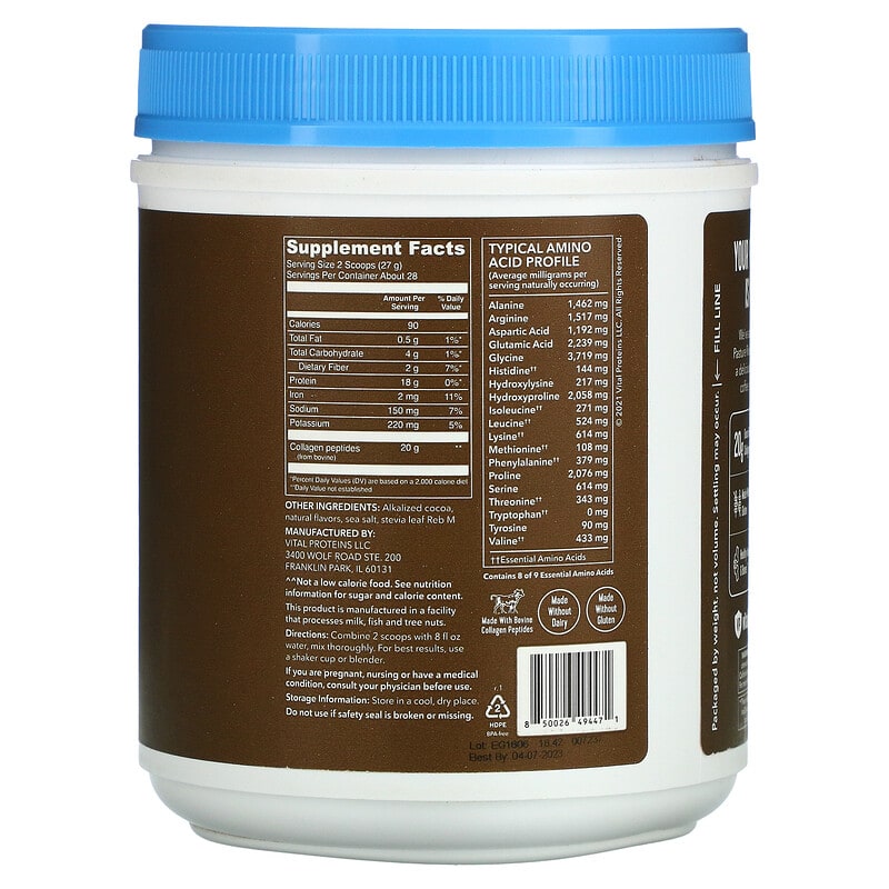 20 g Grass-Fed Collagen0 g Sugar^^Skin, Hair, Nail + Joint SupportMade With Natural CocoaNaturally Flavored with Other Natural Flavors Dietary Supplement Made with Bovine Collagen PeptidesMade Without DairyMade Without GlutenYour Wellness Routine is in For a TreatWe’ve added cocoa to our Grass Fed + Pasture Raised Bovine Collagen Peptides for a deliciously sweet upgrade to your water, coffee, smoothies, recipes and more!Per Serving20 g Grass Fed Collagen0 g SugarPaleo FriendlyMade Without GlutenMade Without DairyKeto FriendlyHealthy Joints & BonesHair & Nail SupportSkin Elasticity^^Not a low calorie food.