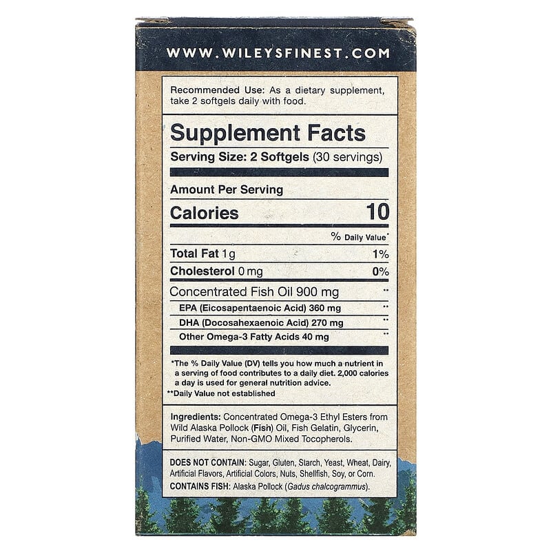 Dietary Supplement Only 2 Per Day630 mg EPA + DHA Omega-3 Per ServingCertified Sustainable Seafood MSCGuaranteed Sustainable SourceContents Certified NSFMay Reduce the Risk of Coronary Heart Disease†Easy to Swallow! Our fresh fish oil is produced in Alaska from wild Pollock caught in US waters. We then purify and gently concentrate the oil up to 75% Omega-3 to make a mini softgel – 55% smaller than regular strength fish oil, yet with 30% more Omega-3. Our StoryExperts in manufacturing Dietary Supplement ingredients for over 25 years, the Wiley Family purifies fish oil at our state of the art, family owned and operated facility located in the heart of the Midwest. Sustainable SourceThank you for choosing seafood that has met the MSC’s global standards for sustainability. †Supportive but not conclusive research shows that consumption of EPA and DHA omega-3 fatty acids may reduce the risk of coronary heart disease. One serving of easy Swallow Minis provides 630 milligrams of EPA and DHA omega-3 fatty acids.