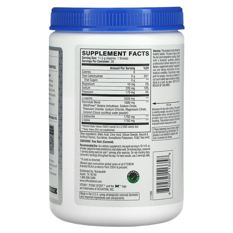 Muscle Recovery + ElectrolytesNSF Certified SportNaturally & Artificially Flavored30 Servings Dietary Supplement The World’s #1 BCAA Brand‡Informed-ChoiceThe Official Recovery Brand of Champions. Each daily serving of Xtend Sport™ supports hydration and recovery without sugar, carbs, or calories. The 14 grams of branched-chain amino acids (BCAAs) in the recommended daily serving promote muscle repair, recovery, and growth, and the electrolyte & performance hydration blend helps fuel overall hydration. ^Xtend Sport™ is NSF certified for Sport®, which guarantees that the product has been tested by one of the most respected independent certification companies in the world and is trusted by professional athletes around the globe. *Per Serving‡Based upon cumulative global sales of all XTEND® branded BCAA products from 2004 to present. ^If used as directed