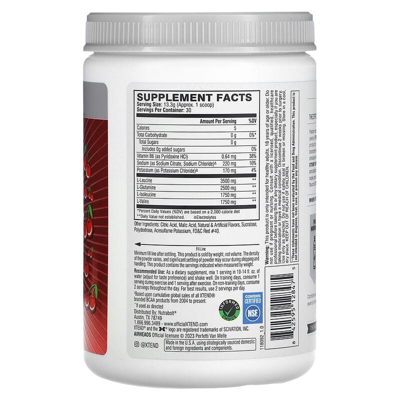 Zero Sugar*7 g BCAAAir HeadsNaturally & Artificially Flavored30 Servings Dietary Supplement The World’s #1 BCAA Brand‡Informed ChoiceNSF Contents CertifiedThe Official Recovery Brand of Champions. Faster recovery is the key to better results. For over 10 years, XTEND® has been making the best recovery products in the world. Powered by 7 grams of branched-chain amino acids [BCAAs], which have been clinically shown to support muscle recovery and growth, XTEND® ORIGINAL also contains hydrating electrolytes and additional performance ingredients to help you refuel, repair, and recover. ^ Try all the sugar-free, mouthwatering flavors of XTEND® to support your fitness goals. Combine with any XTEND® branded product every day, even on rest days, to help maximize your recovery. *Per serving‡Based upon cumulative global sales of all XTEND® branded BCAA products from 2004 to present. ^If used as directed