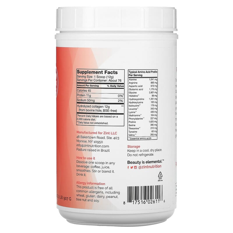 Thực phẩm chức năng Zint Pure Grass-Fed Collagen Peptides 2 lbs (907 g) chính hãng nhập khẩu từ Mỹ, Mã vạch 817516026116, Quy cách: 1.04 kg,
